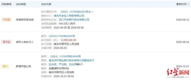 据天眼查官网,股权持有人老实人商贸为四川天府银行第35大股东,共持有该行340万股股份,目前这些股份已全部被法院冻结。该公司成立于1998年,是一家以从事批发业为主的企业,实际控制人为严仕刚。