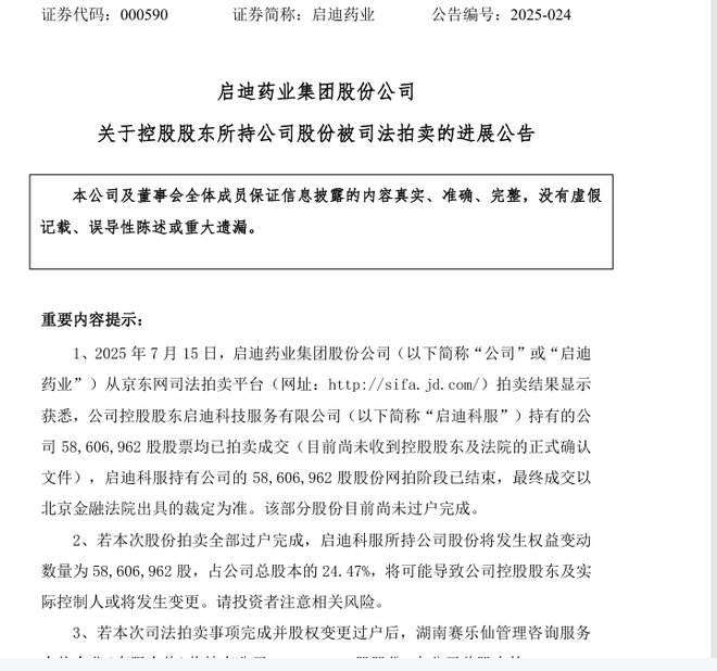 7月16日消息,7月15日晚间,启迪药业集团股份有限公司(下称“启迪药业”,000590.SZ)发布公告称,公司控股股东启迪科技服务有限公司(下称“启迪科服”)持有的公司5860.7万股股票在京东网司法拍卖平台拍卖成交。
