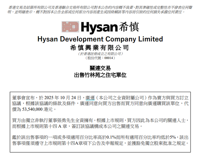 10月24日,港股上市公司希慎兴业(00014.HK)发布公告称,当日全资子公司广运作为卖方与买方订立协议,根据该协议的条款及条件,广运同意向买方出售位于竹林苑的一个住宅单位(实用面积约为2084平方呎,约合193平方米),价格为5354万港元。