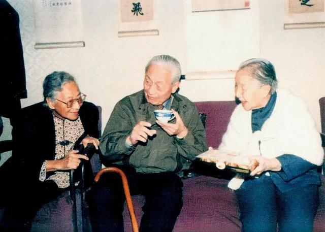 1992年10月,雷洁琼(左)与赵朴初在冰心家中聚会畅谈。