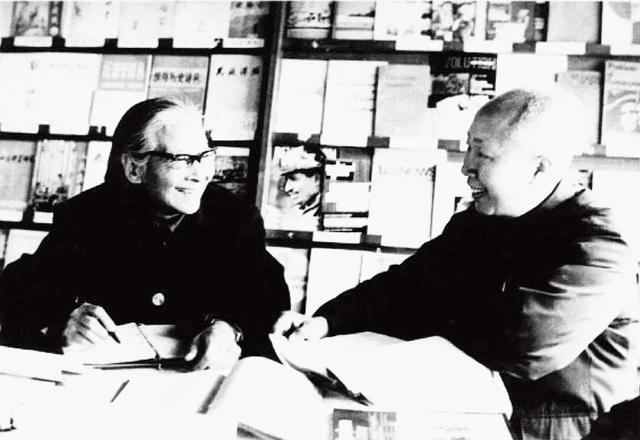 下图:1980年秋,雷洁琼(左)在北京大学任教时与国际政治系赵宝煦教授作学术探讨。