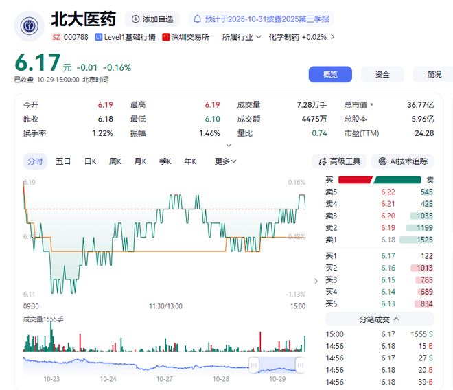 二级市场方面,近日北大医药股价持续下跌,截至今日收盘,报6.17元/股,总市值36.77亿元。