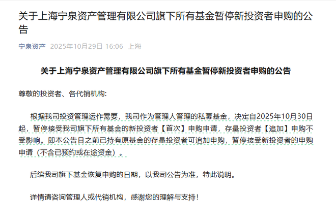 宁泉资产表示,根据公司投资管理运作需要,公司作为管理人管理的私募基金,决定自2025年10月30日起,暂停接受旗下所有基金的新投资者(首次)申购申请,存量投资者(追加)申购不受影响。即公告日之前已持有原基金的存量投资者可追加申购,暂停接受新投资者的申购申请(不含已预约或在途资金)。