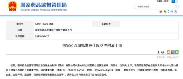 今年6月27日,1类创新药玛仕度肽注射液正式获批上市。图/国家药品监督管理局官网