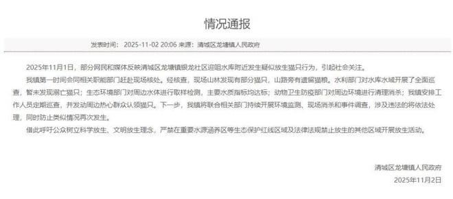 2025年11月1日,部分网民和媒体反映清城区龙塘镇银龙社区迎咀水库附近发生疑似放生猫只行为,引起社会关注。