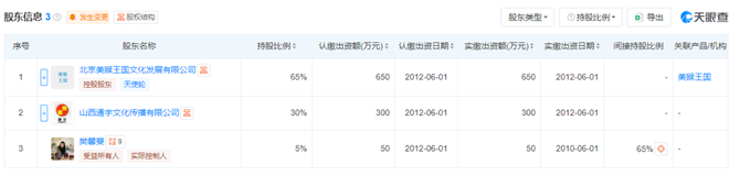 该公司的股东有三个:北京美猴王国文化发展有限公司持股65%,山西通宇文化传播有限公司持股30%,樊馨蔓持股5%。