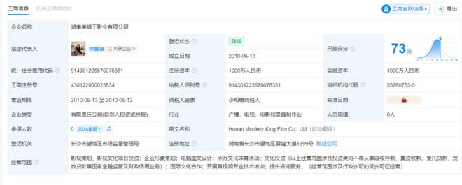 天眼查显示,湖南美猴王影业有限公司成立于2010年6月,法定代表人、董事长为张纪中前妻樊馨蔓,张纪中任董事、总经理,注册资本1000万人民币,经营范围包括影视策划、影视文化项目投资等。