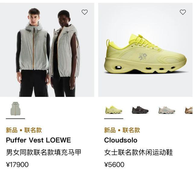 从2022年开始,On昂跑就和奢侈品牌LOEWE(罗意威)搭上线,时不时就扔一波联名炸弹。最新的2025秋冬Cloudsolo系列,就于近期开售,运动鞋标价直接飙升至了5600元,联名款马甲更是高达17900元。