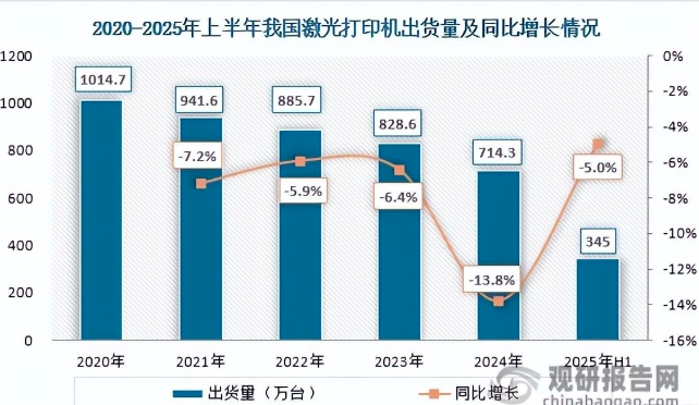 近年来,激光打印机行业呈现下滑趋势。观研天下研究报告显示,2020年至2024年间,我国激光打印机出货量从1014.7万台降至714.3万台,累计下降约29.6%。