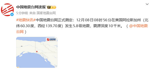 中国地震台网正式测定:12月08日08时56分在美国阿拉斯加州(北纬60.30度,西经139.70度)发生5.8级地震,震源深度10千米。