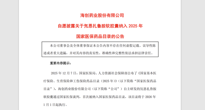 12月7日,海创药业(688302.SH)发布公告,公司自主研发的氘恩扎鲁胺软胶囊通过国家医保谈判,首次被纳入国家医保药品目录。