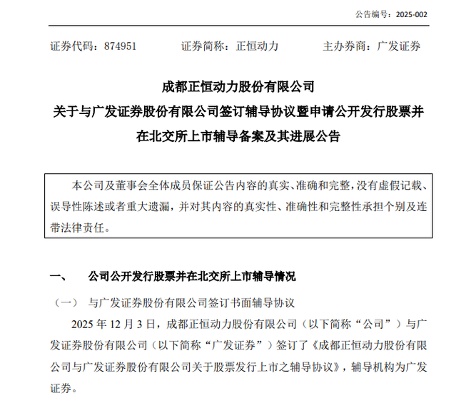 微成都报道 近日,新三板基础层挂牌公司成都正恒动力股份有限公司(简称“正恒动力”)公告称,已获四川证监局上市辅导备案登记,正式启动北京证券交易所IPO进程,辅导机构为广发证券。