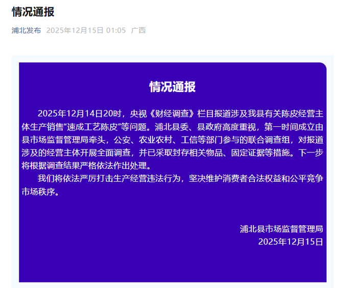 2025年12月14日20时,央视《财经调查》栏目报道涉及我县有关陈皮经营主体生产销售“速成工艺陈皮”等问题。浦北县委、县政府高度重视,第一时间成立由县市场监督管理局牵头,公安、农业农村、工信等部门参与的联合调查组,对报道涉及的经营主体开展全面调查,并已采取封存相关物品、固定证据等措施。下一步将根据调查结果严格依法作出处理。