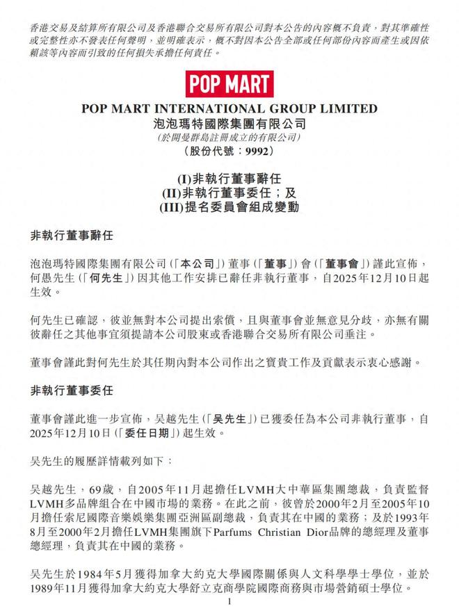 12月10日,泡泡玛特的一则公告在资本市场投下了一粒颇为耀眼的石子:69岁的LVMH大中华区集团总裁吴越,接替黑蚁资本管理合伙人何愚,出任公司非执行董事。