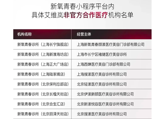 不止斐缦生物,另一家厂商普丽妍也在11月22日发布了一份名单,将40余家新氧青春诊所列为“非官方合作医疗机构”。