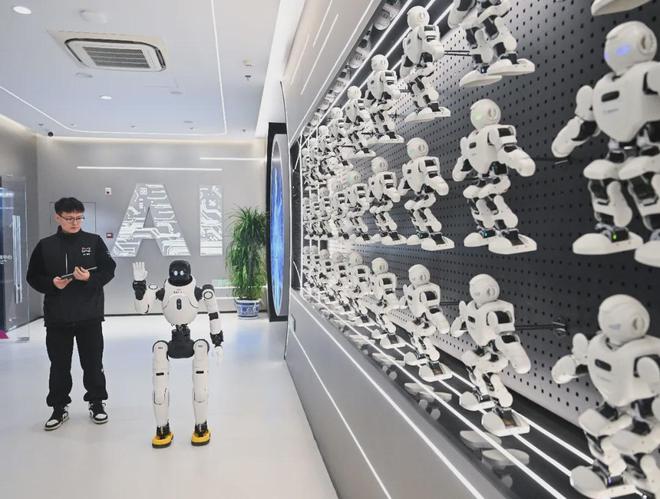 12月4日,在南京人工智能生态街区的“AI·模坊”南京智能体集散中心,一款机器人在打招呼。