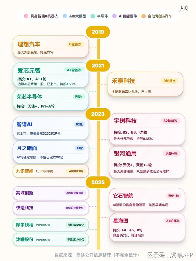 机器人除了宇树,美团还投了银河通用、星海图、自变量等业界公认的头部企业。同时也投了很多AI模型、具身机器人、芯片算力方面的独角兽。大家熟知的智谱AI、月之暗面等大模型公司,芯片算力相关的沐曦股份、摩尔线程、紫光展锐也都投了。