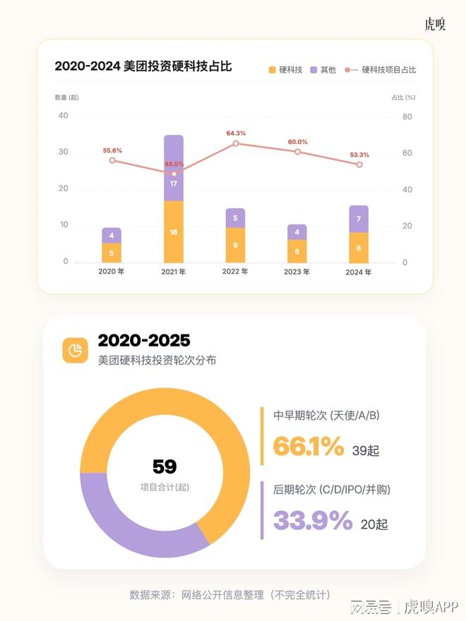 早在2020年,美团就已入场投资硬科技,公司的战略也从“Food+Platform”转向“零售+科技”。之后更是火力全开,每年投资的硬科技项目占比几乎都过半。