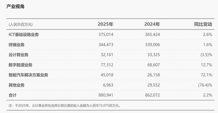 作为大众最熟知的业务板块,终端业务2025年实现收入3444.73亿元,同比增长1.6%,营收规模与ICT基础设施业务已十分接近。