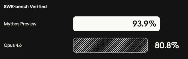 在代码基准测试SWE-bench Verified上,Mythos Preview得分达93.9%,同期Claude Opus 4.6为80.8%。