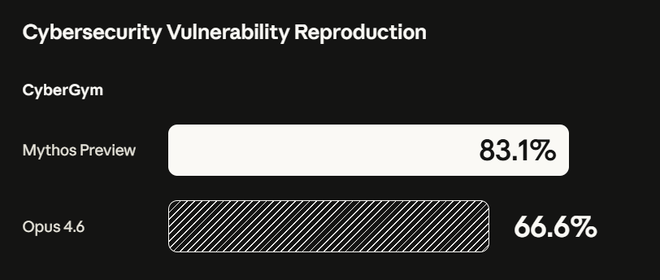 在专项网络安全基准CyberGym上,Mythos Preview得分83.1%,Opus 4.6为66.6%。